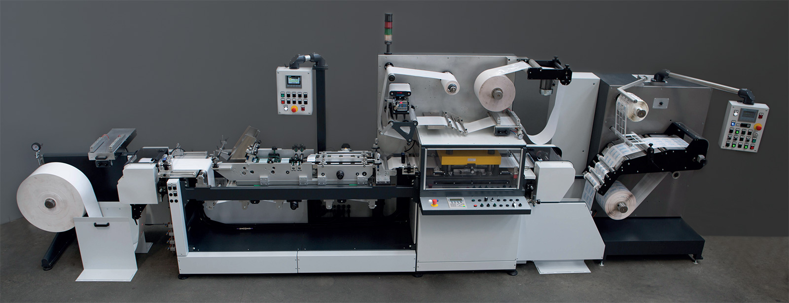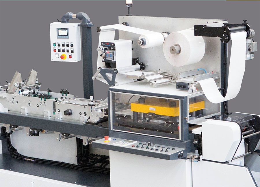 Machine for the production of booklet labels from reel to reel, composed of unwinding group, sheet feeder unit, group of plasticizing/laminating in register, flat die-cutting unitwith electronic centesimal setting of punching pressure, paper feed group with electronic decimal programming of printing step, scraping/rewinding group with longitudinal cutting.